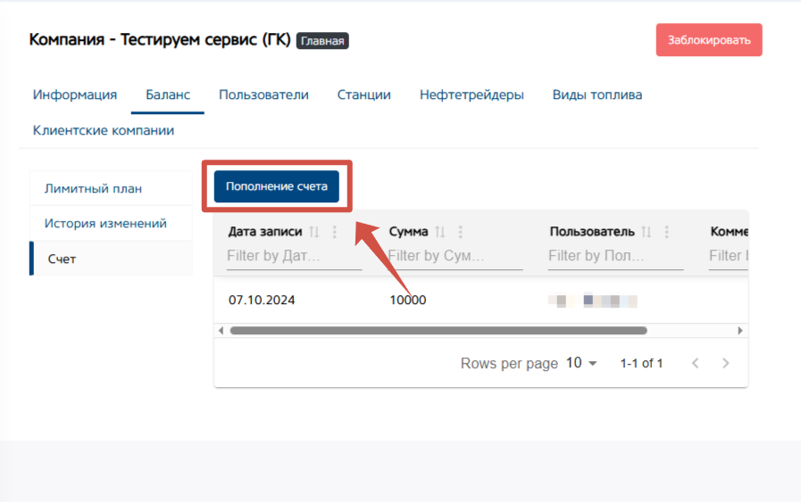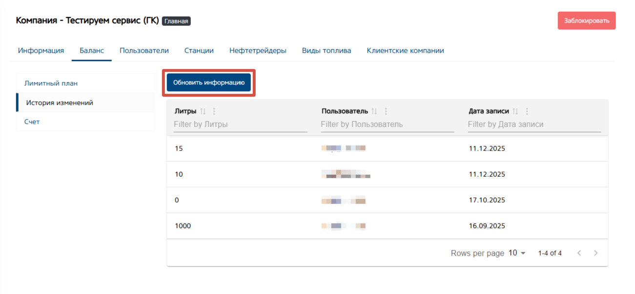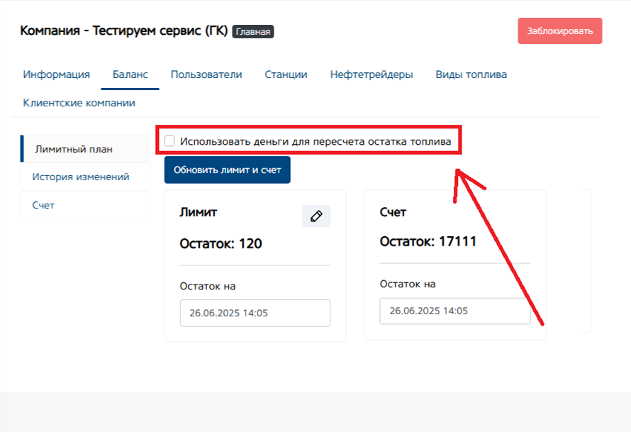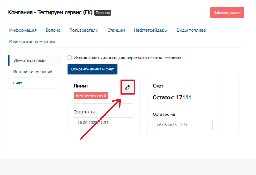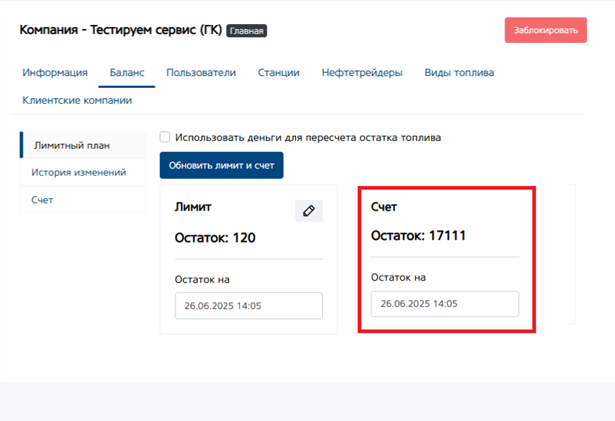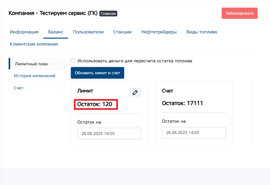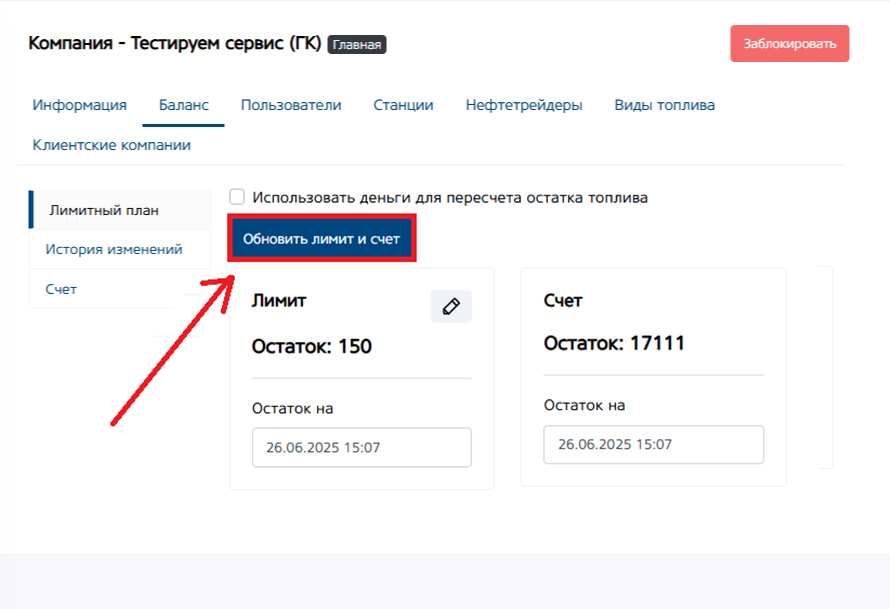 Кнопка "Обновить лимит и счет". При нажатии этой кнопки обновится денежный лимит и лимит в литрах. Например, после внесения каких-либо изменений в лимит\счет, необходимо нажать эту кнопку, чтобы ниже отображался корректный остаток.