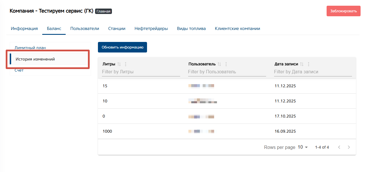 Если у компании установлен лимит в литрах, каждая проведенная выдача топлива пользователем этой компании будет уменьшать лимит.