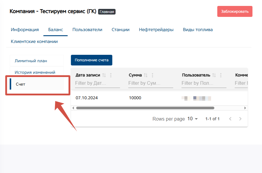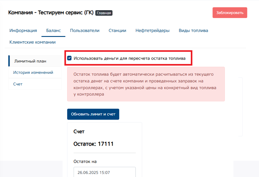 Использовать деньги для пересчета остатка топлива. Если поставить эту галочку, счет компании начнет работать как лимит. Приведем пример, у компании на счету 10 000р. Мы установили на ДТ цену 100р. за 1 литр для этой компании. После этого, пользователи этой компании не смогут выдать больше 100л., т.к. 10 000р. (их счет) / 100р. (цена на 1л.) = 100л. После каждой выдачи топлива пользователями этой компании, счет будет уменьшаться исходя из цены на вид топлива