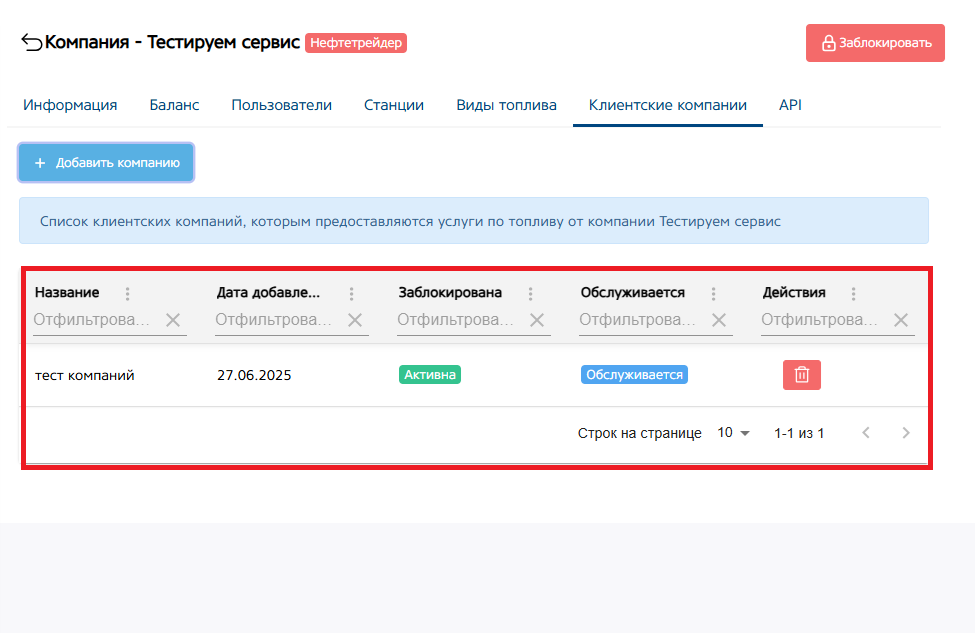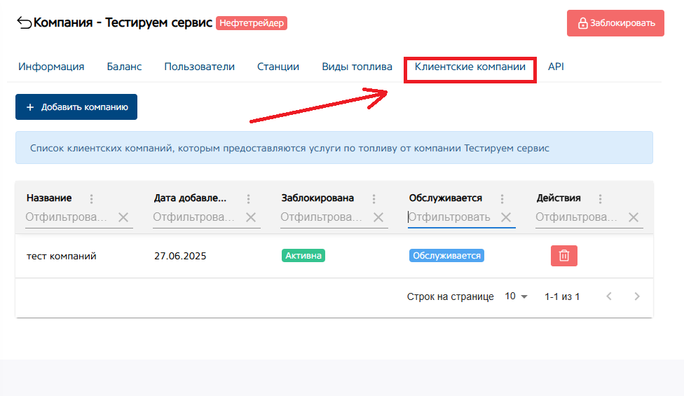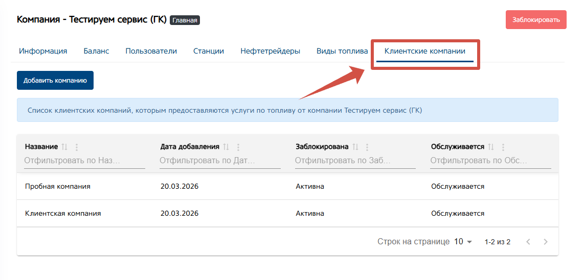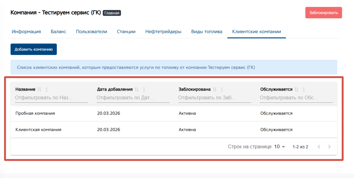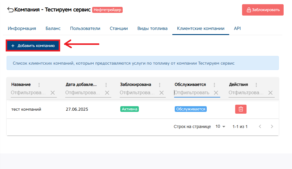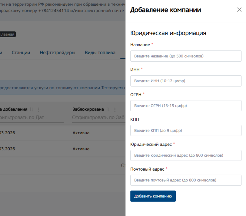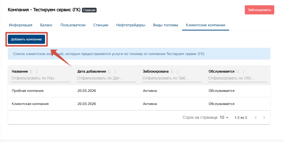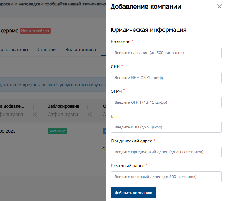 Кнопка «Добавить компанию». При нажатии кнопки откроется меню с возможностью добавления компании.