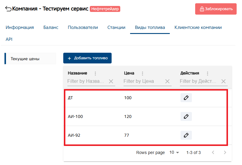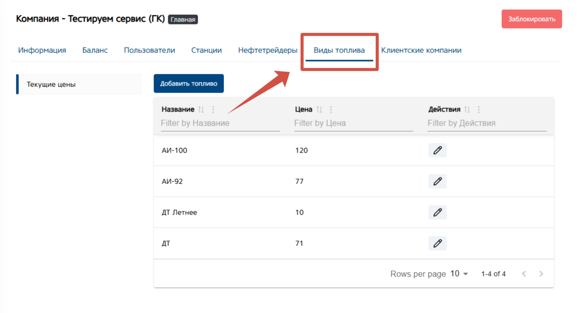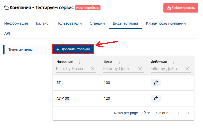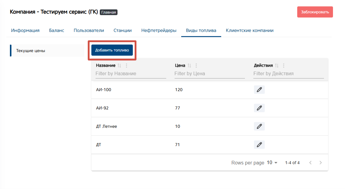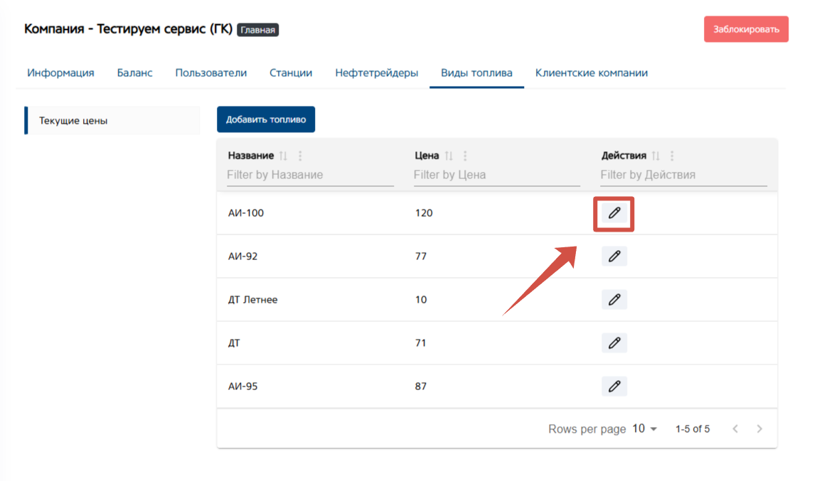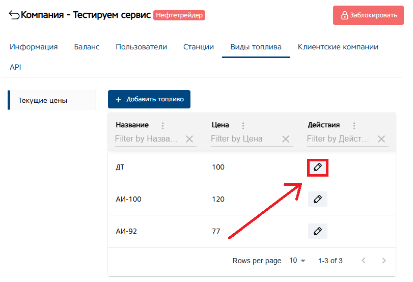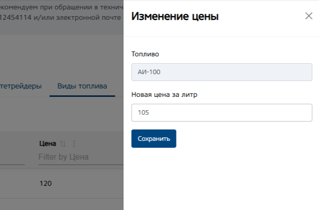 Кнопка «Действие», для редактирования цены на вид топлива