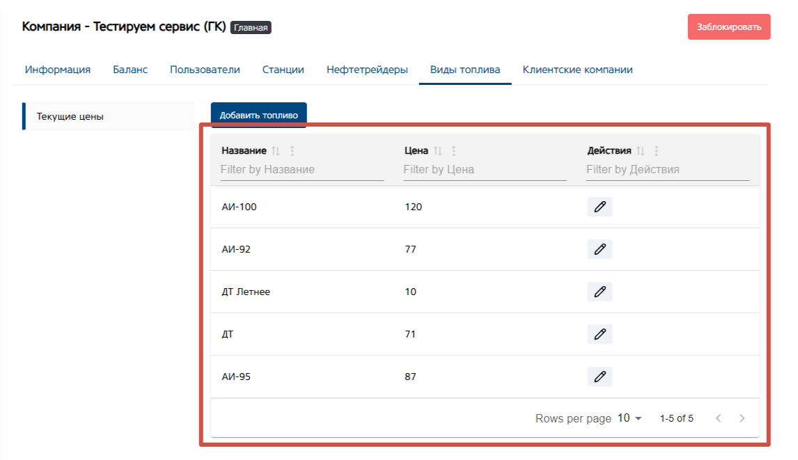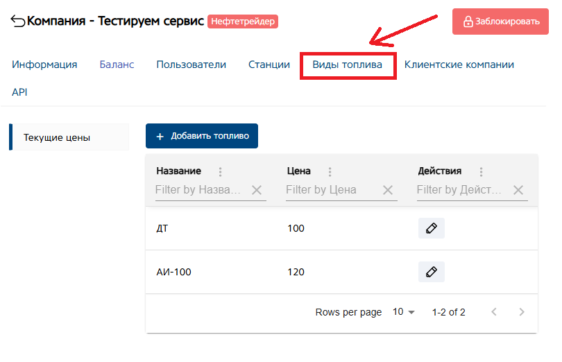 В нем вы можете добавить виды топлива и указать цену за 1 литр. Данная цена будет использоваться в денежном счете компании. Для разных компаний можно указать разные цены.