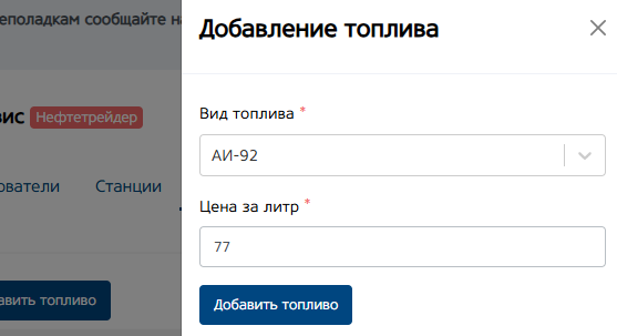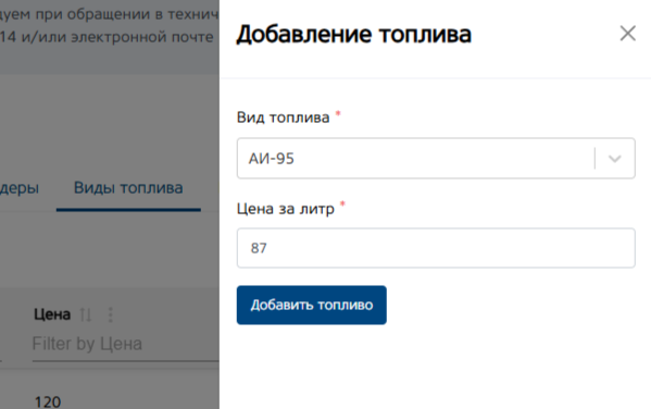 Кнопка «Добавить топливо». При нажатии кнопки откроется меню, для добавления цены на определенный вид топлива.