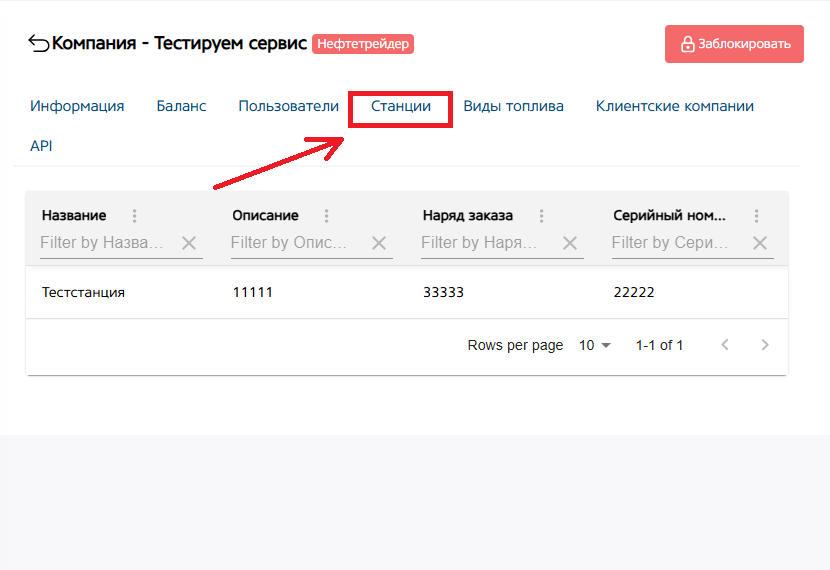 В данном разделе имеется таблица со всеми станциями (резервуарами) компании. Таблица имеет следующие значения: