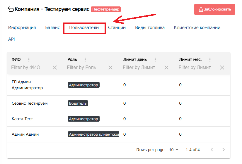 В данном разделе имеется таблица со всеми пользователи компании. Таблица имеет следующие значения: