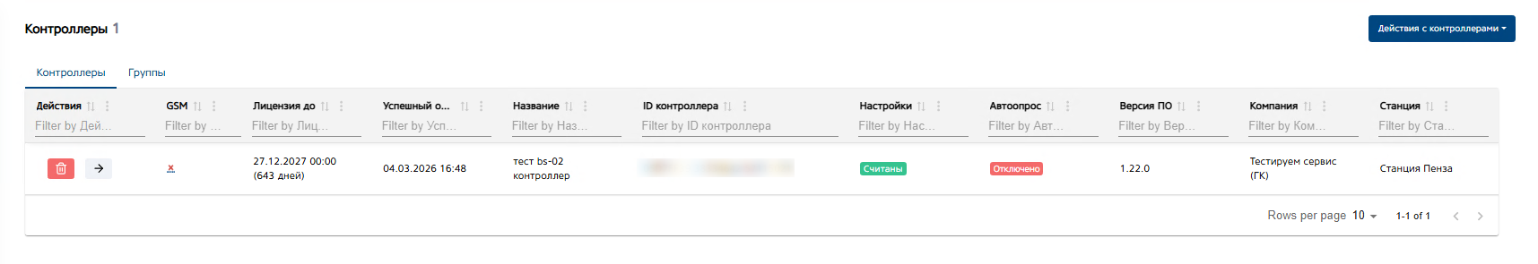 Кнопка «Действия с контроллерами». При нажатии на кнопку откроется выпадающий список с возможных действиями с контроллерами.