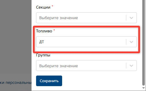 Секции. При нажатии на кнопку откроется список всех секций вашей станции. Выберите секции, к которой будет привязан контроллер. Т.е. грубо говоря из каких секций контроллер сможет выдавать топливо.