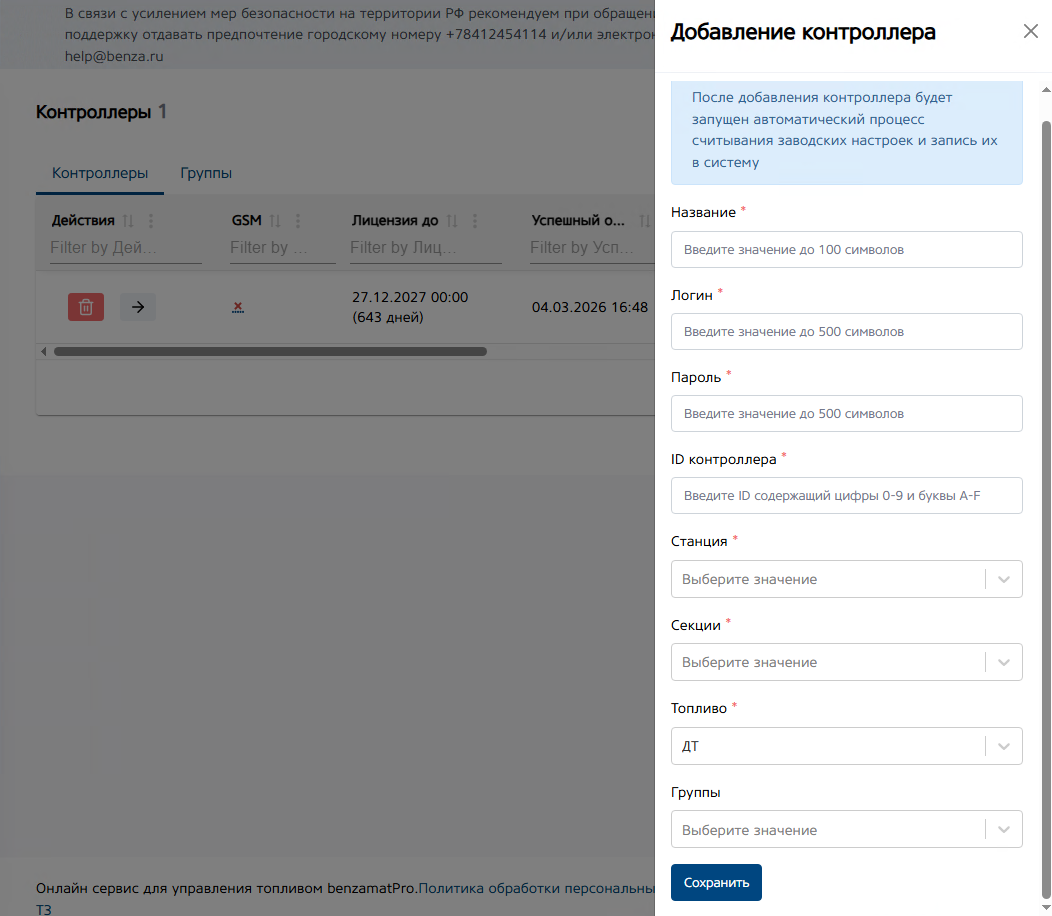 После заполнения всей необходимой информации, нажмите на кнопку «Сохранить», что бы контроллер был добавлен в сервис.