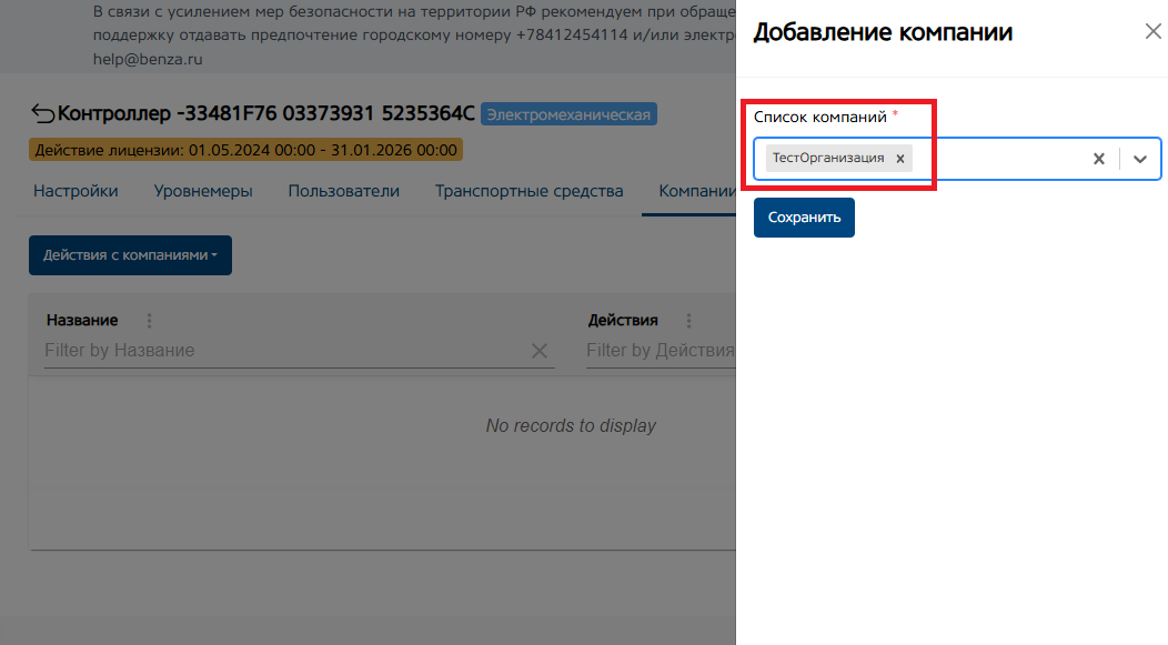 Появляется окно добавления компании, где нужно выбрать организацию, которые хотите добавить. По нажатию на кнопку «сохранить», выбранные компании будут добавлены в контроллер.