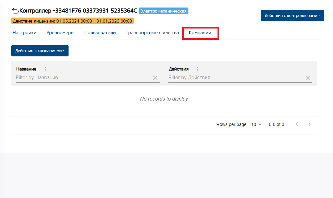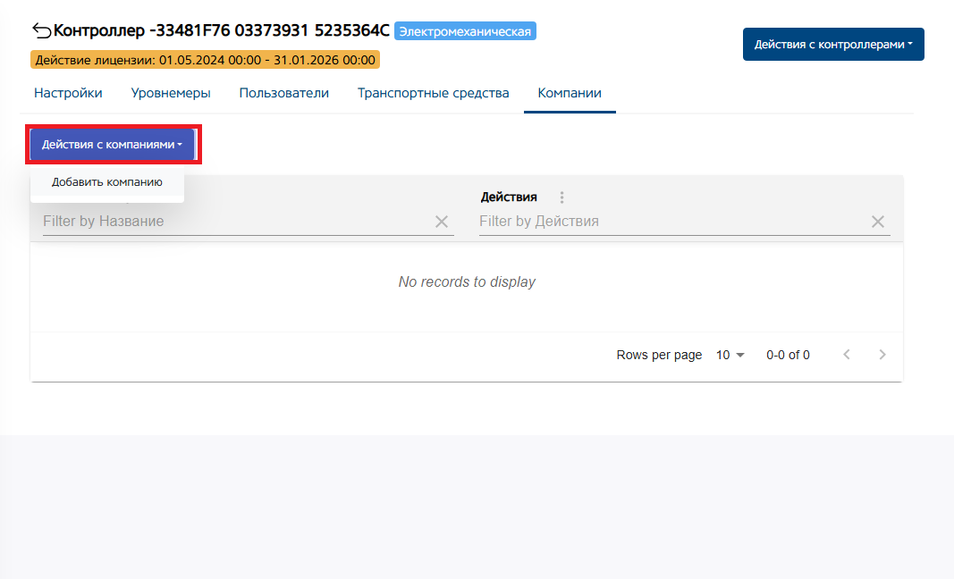 Кнопка «действия с компаниями» - «добавить компанию», позволяет добавить необходимые компании в контроллер.