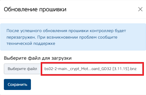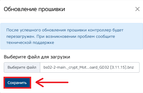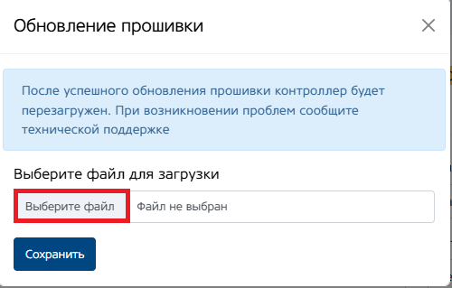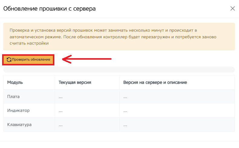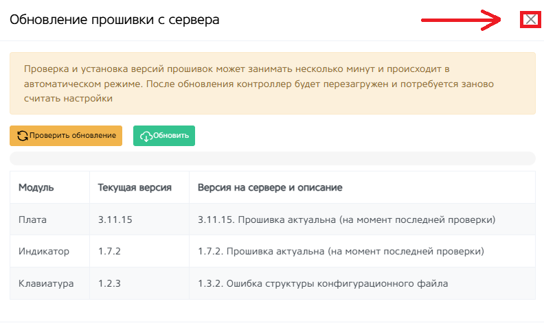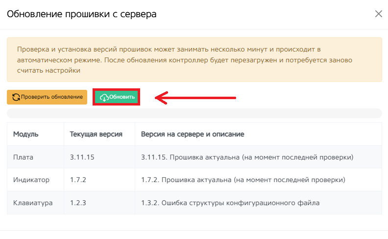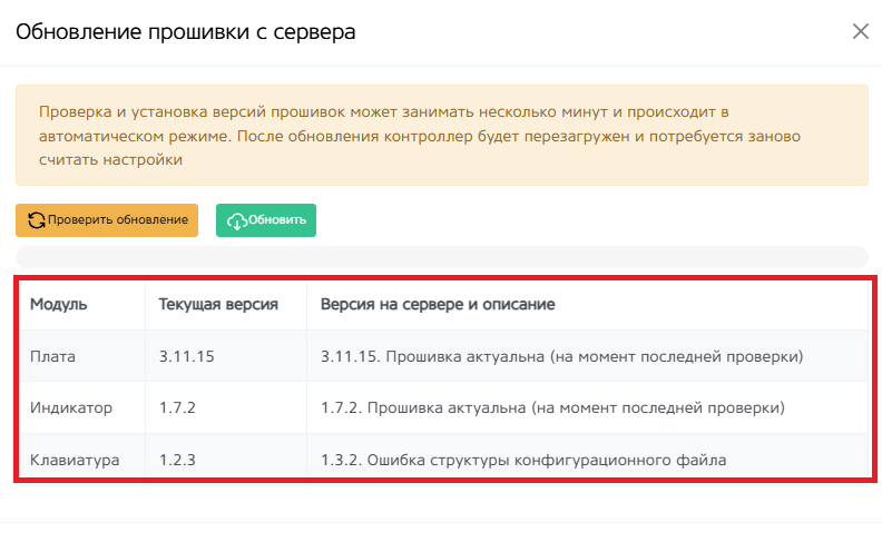 Кнопка «Проверить обновление». При нажатии на кнопку отобразятся текущие версии модулей контроллера, и доступные для обновления версии.