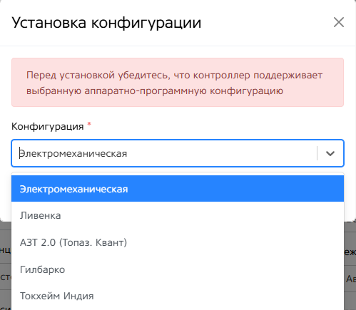 При нажатии на кнопку «Установка конфигурации», откроется меню с возможностью изменить конфигурацию (режим работы) контроллера.
