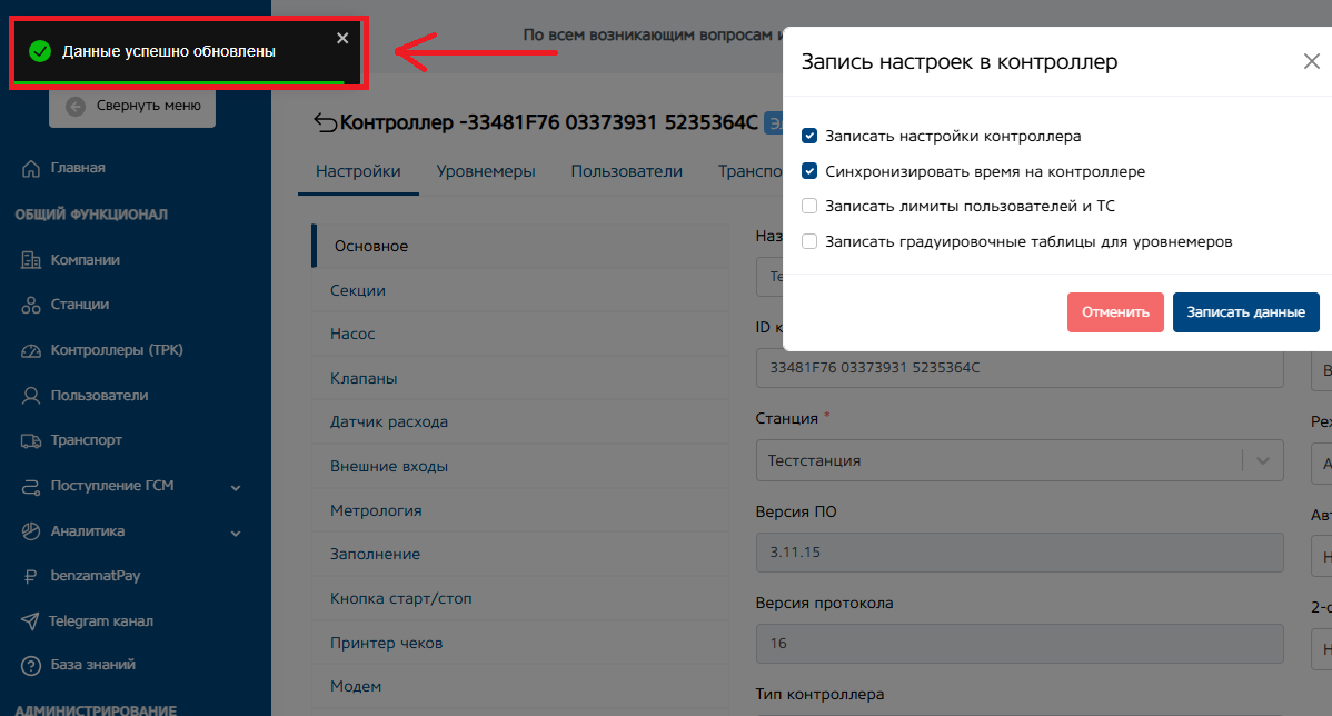 При успешной записи данных, в левом верхнем углу появится соответствующее уведомление. При ошибке, в этом же окне будет описана ошибка, почему не удалось записать данные.