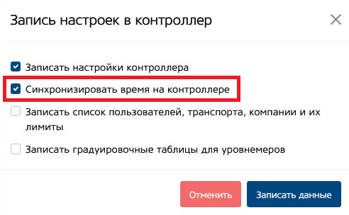 Синхронизировать время на контроллере. Галочка отвечает за обновление времени на табло контроллера\ТРК. Например, на табло контроллера отображается 11:09, а фактически 11:12. Запись настроек с этой галочкой обновит время на табло контроллера\ТРК до 11:12