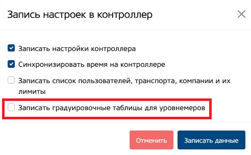 Записать градуировочные таблицы для уровнемеров. Галочка отвечает за запись градировочных таблиц (для датчиков уровня топлива, работающих по протоколу Ommnicomm) в контроллер.