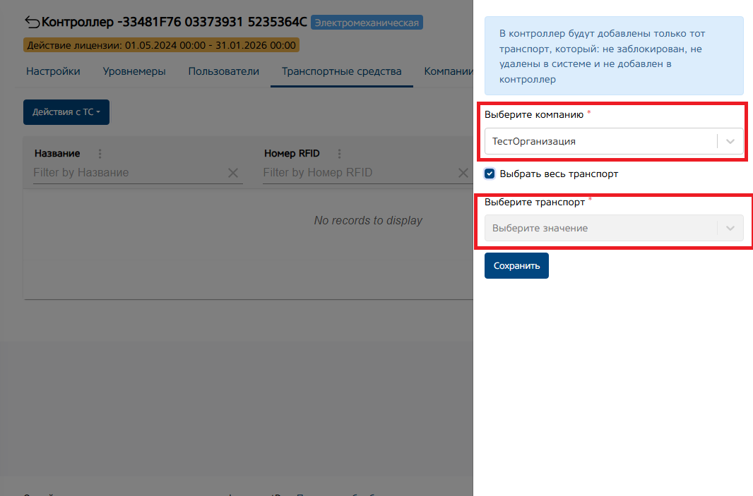 Появляется окно добавления ТС, где нужно выбрать организацию и ТС, которые хотите добавить. Если поставить галочку «выбрать все ТС», будут добавлены все ТС, состоящие в указанной организации. По нажатию на кнопку «сохранить», выбранные ТС будут добавлены в контроллер.