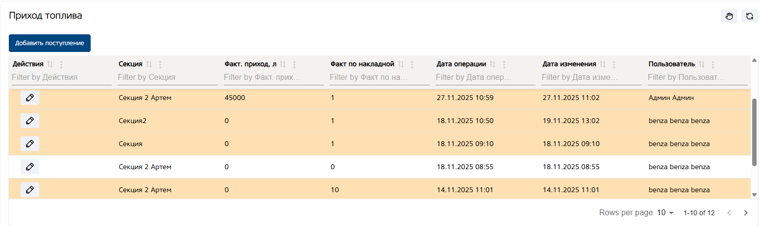- Прием топлива
