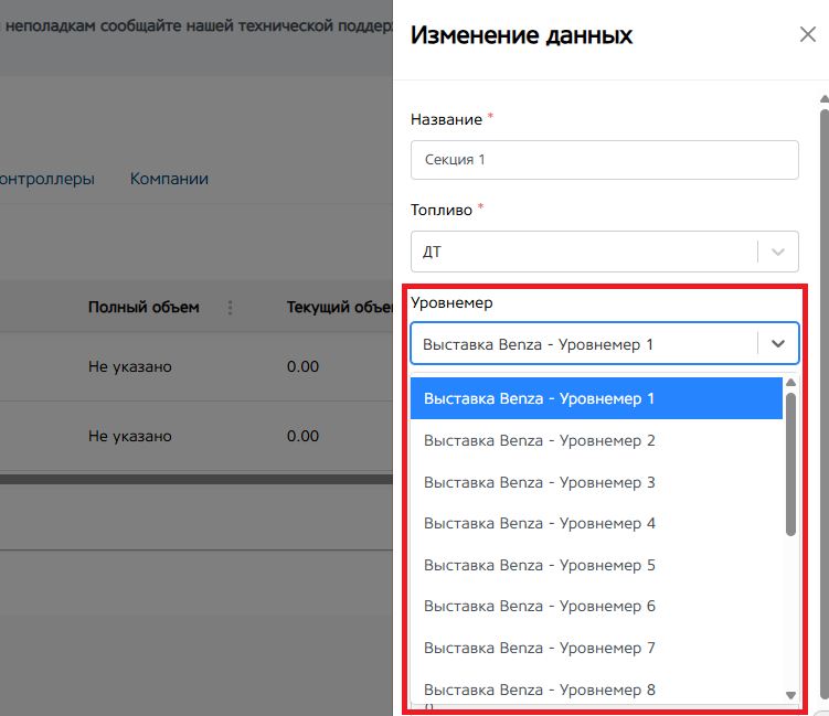 Уровнемер. При нажатии на кнопку откроется список уровнемеров контроллера. Необходимо выбрать уровнемер, который будет привязан к этой секции. Показания заполненности секции будут браться исходя из выбранного уровнемера.