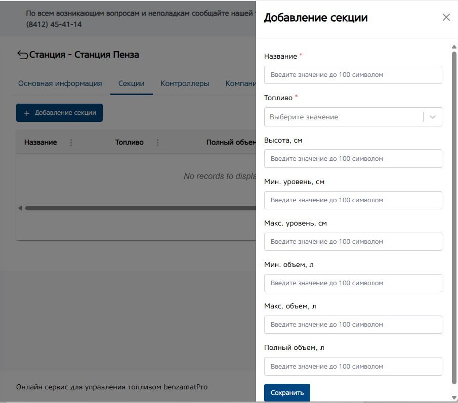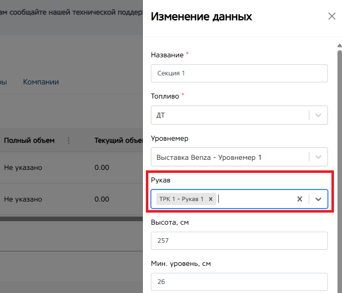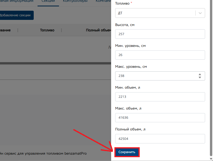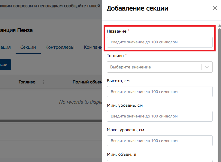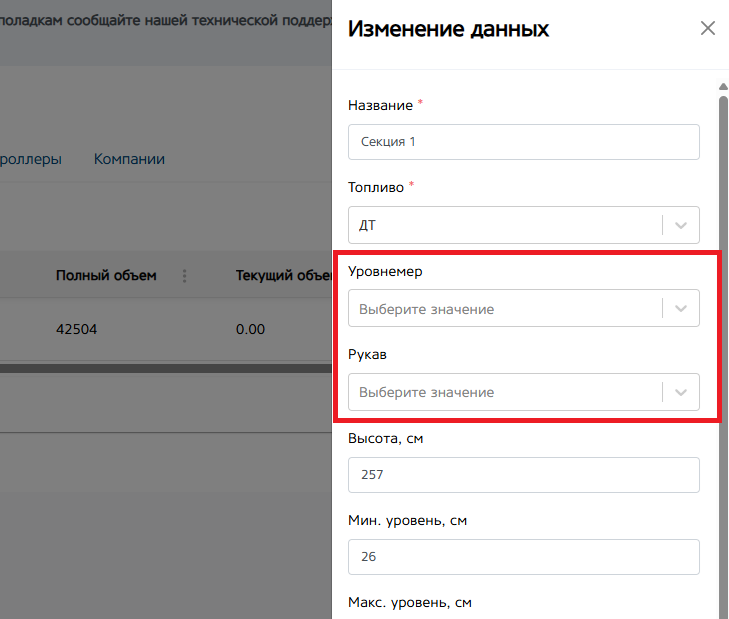 Мин. и макс. Уровень (см.). Укажите максимальную и минимальную высоту топлива в секции. Поле не обязательно для заполнения.
