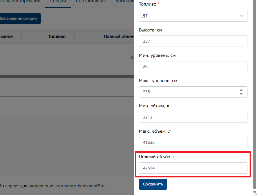 Полный объем (л.). Укажите полный объем топлива в секции. Именно это значение будет использоваться, для высчитывания процента заполнения секции из текущего объема.