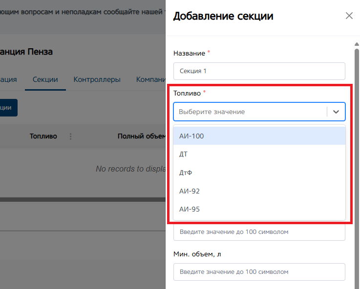 Мин. и макс. объем (л.). Укажите максимальный и минимальный объем топлива в секции. Поле не обязательно для заполнения.