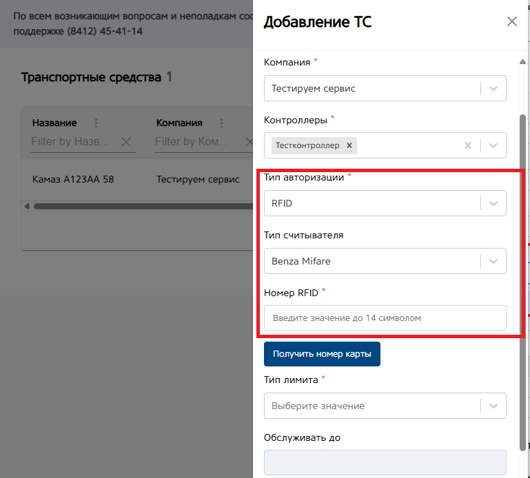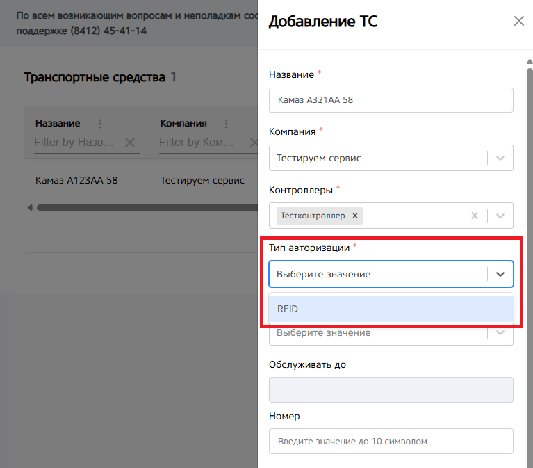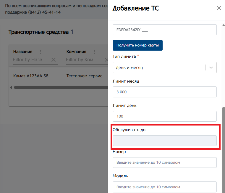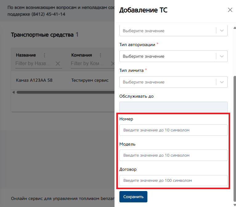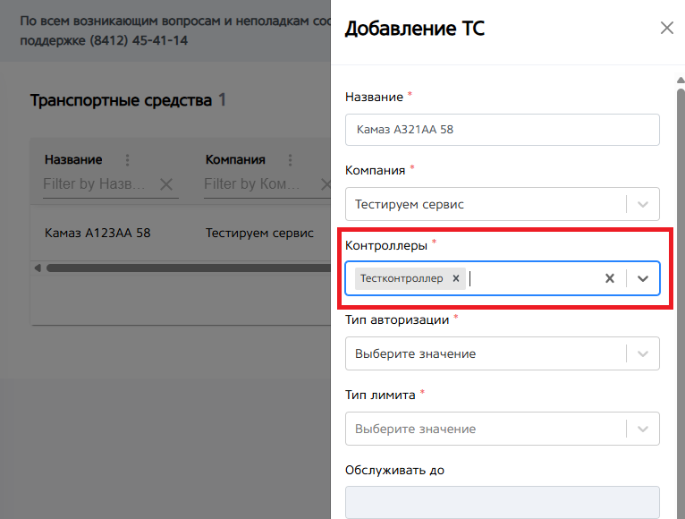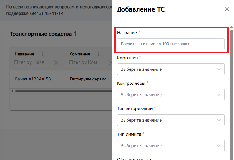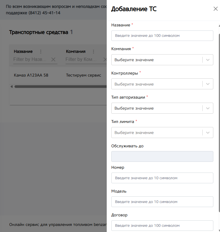 Для добавления транспорта, необходимо заполнить следующие поля: - Название* - Компания* - Контроллеры* - Тип авторизации* - Тип лимита* - Обслуживать до - Номер - Модель - Договор