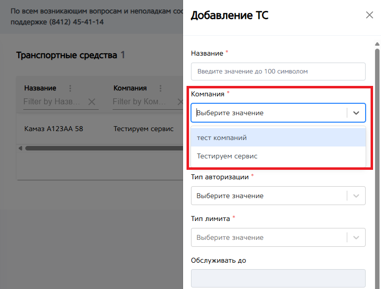 Компания. При нажатии на кнопку, откроется список всех ваших основных и дочерних компаний. Вам необходимо выбрать компанию, к которой будет привязан ТС после добавления.