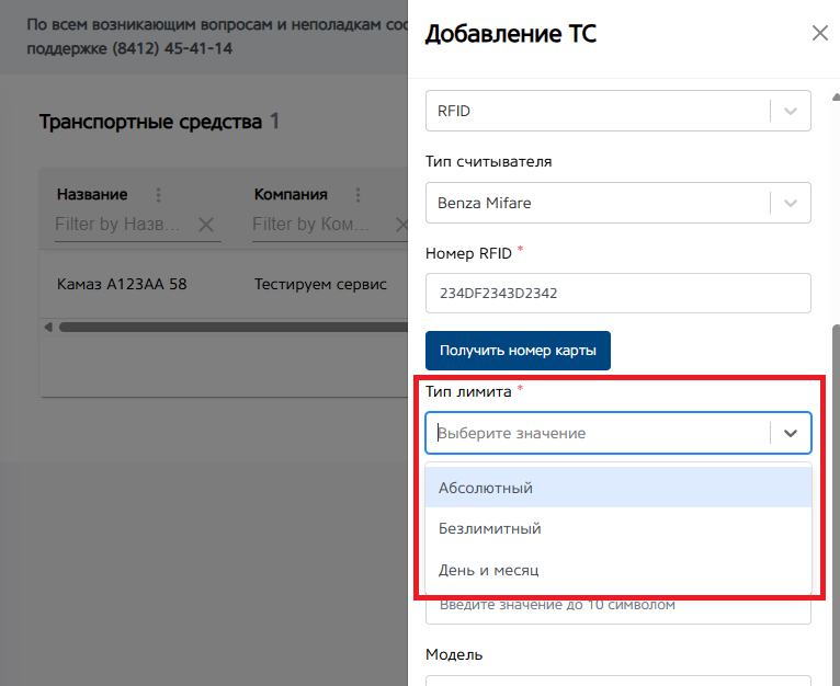 Тип лимита. ТС необходимо установить тип лимита, всего имеется 3 типа: Абсолютный, Безлимитный, День и месяц