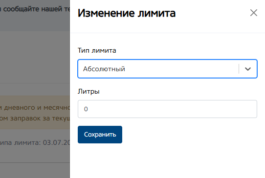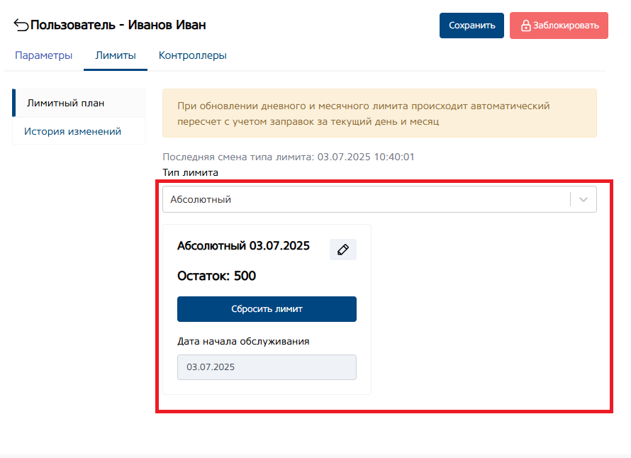 Абсолютный лимит — это фиксированное ограничение, которое не обновляется автоматически. Например, если пользователю установлен лимит в 2000 литров, то после исчерпания этого объема дальнейшая заправка будет невозможна до тех пор, пока Администратор программы вручную не увеличит или не сбросит лимит. Такой подход обеспечивает жёсткий контроль расхода ресурсов и предотвращает превышение заданных пределов без дополнительного вмешательства.