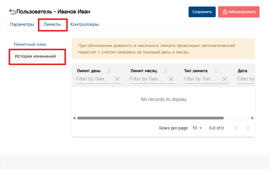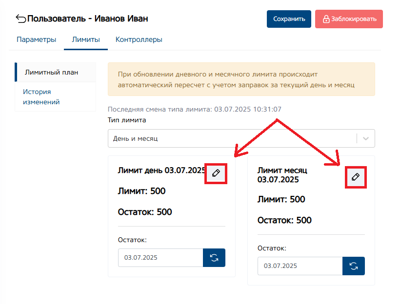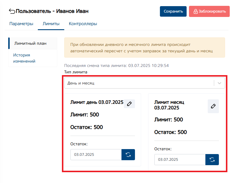 В этом разделе вы можете увидеть установленный лимит пользователя на день\месяц. Так же его остаточный лимит на день\месяц.