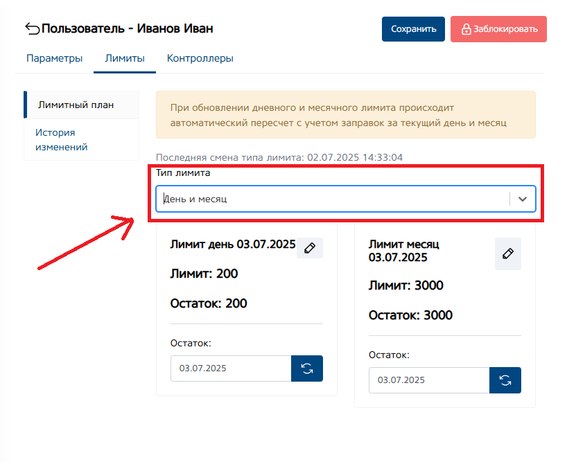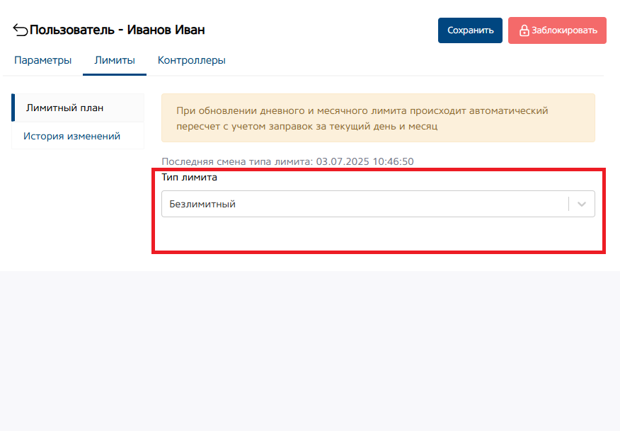 Тип лимита. В этом разделе можно изменить тип лимита пользователя.