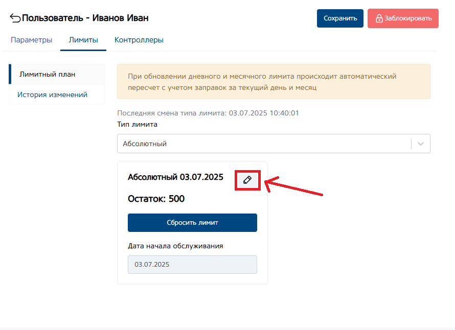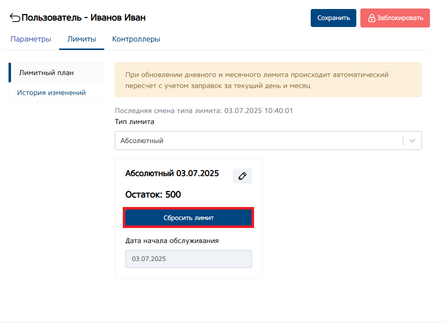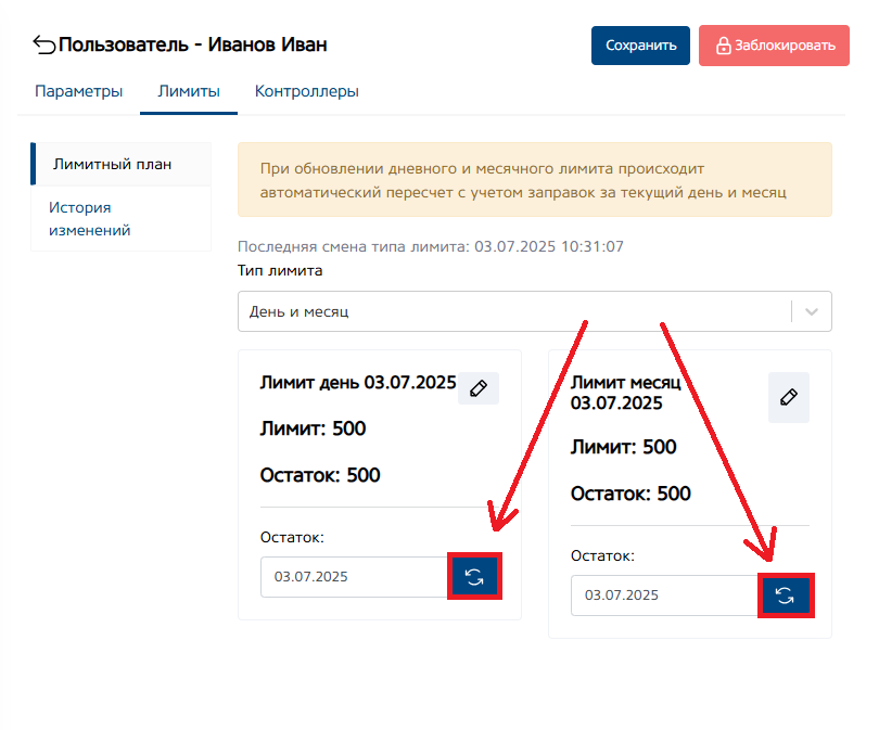 Кнопка «Сбросить лимит». При нажатии на кнопку у пользователя будет сброшен лимит. Т.е. если вы установили пользователю 2000л. абсолютного лимита, а сейчас у него осталось 500л., при нажатии на кнопку у пользователя снова будет 2000л.