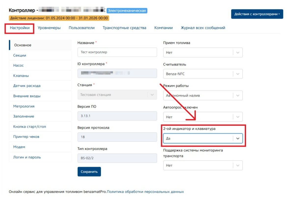 Перейдите во вкладу «Настройки». В поле «2-ой индикатор и клавиатура» установите значение «Нет». Нажмите на кнопку «Сохранить». Данная настройка используется ТОЛЬКО двухсторонних ТРК (у которых два индикатора и две клавиатуры).