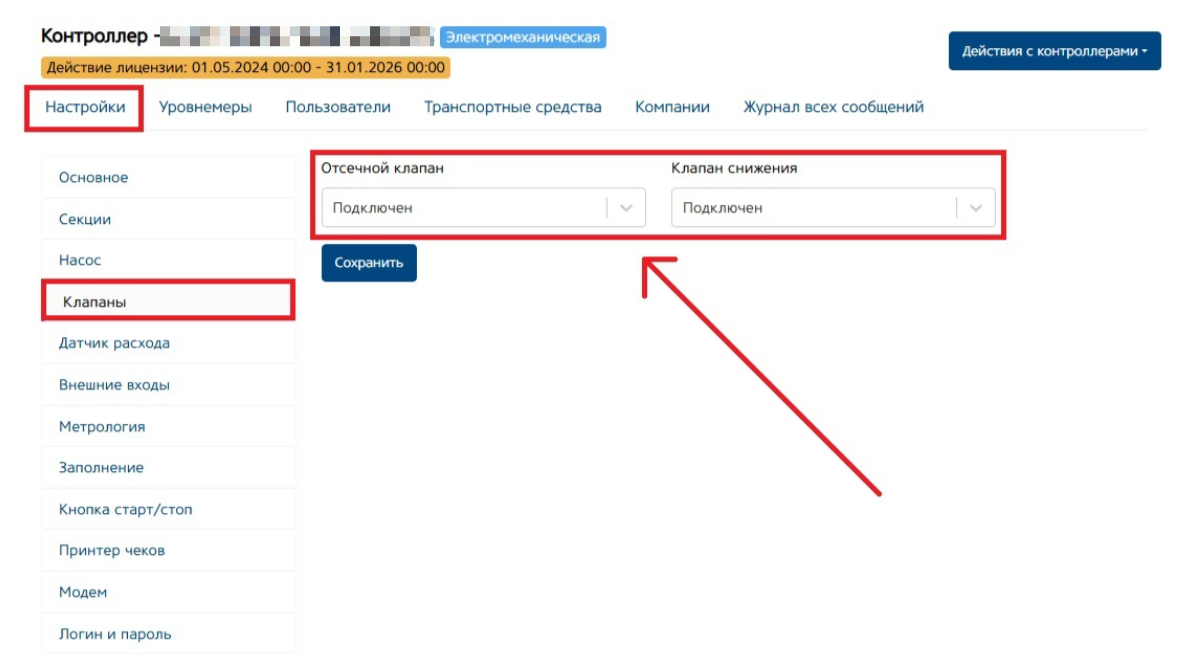 Далее перейдите во вкладку «Клапаны». В обоих клапанах установите значение «Подключен» и нажмите на кнопку «Сохранить».