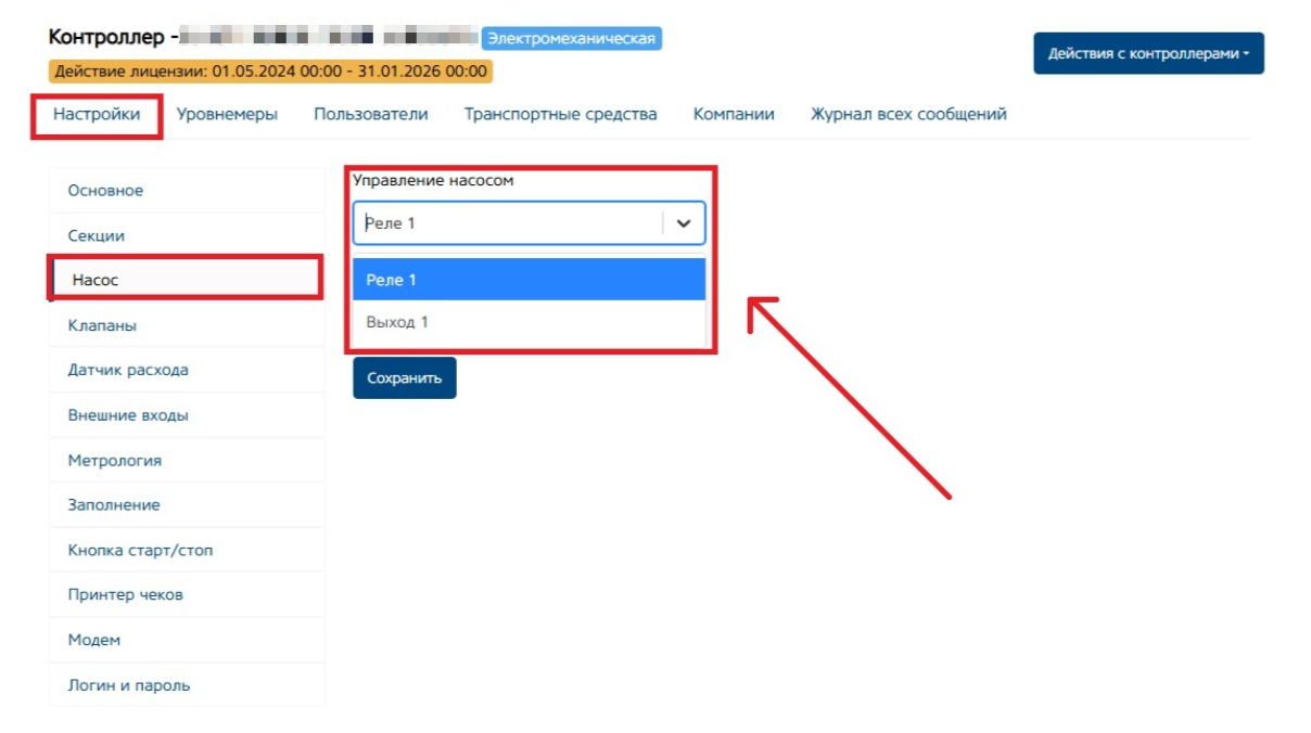 Перейдите во вкладу «Настройки», раздел «Насос». Попробуйте установить другой способ включение насоса. Например было выбрано «Реле 1» — установите «Выход 1». Если «Выход 1» — установите «Реле 1». После смены нажмите на кнопку «Сохранить».