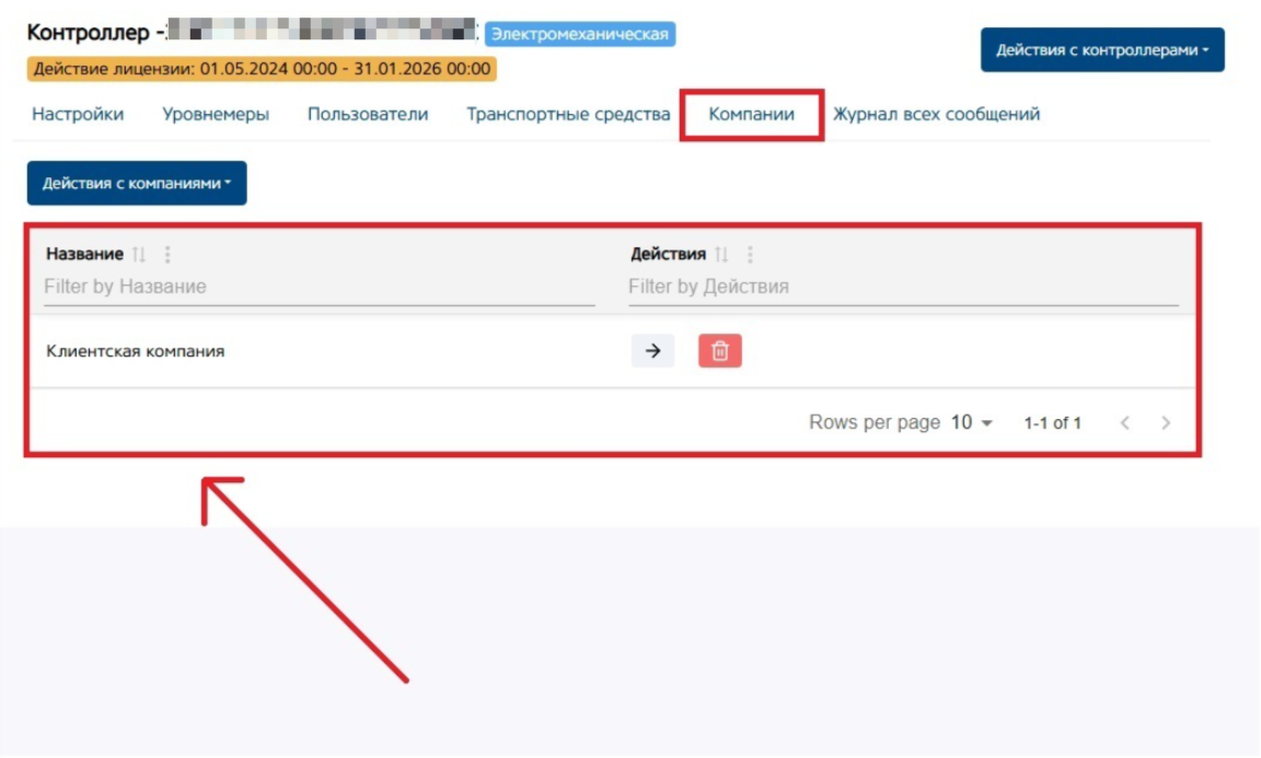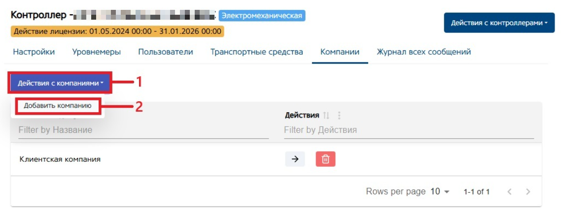 Перейдите во вкладу «Компании». В открывшемся окне вы можете увидеть список добавленных компаний в контроллер. Если компания не добавлена — пользователи и ТС этой компании не смогут произвести отпуск топлива.