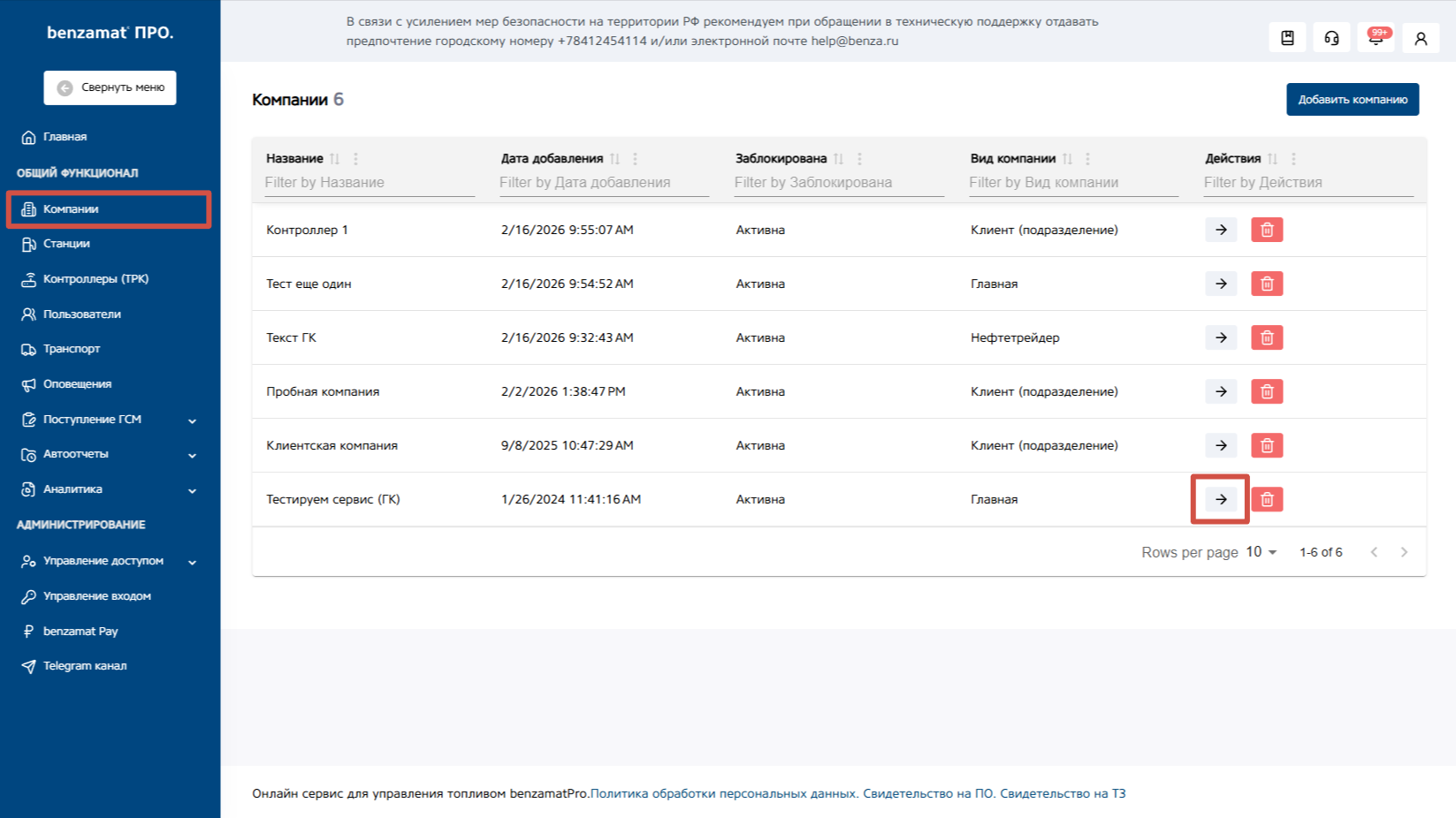 Откройте раздел «Компании» и откройте настройки компании пользователя или транспорта, с котором произошла ошибка.