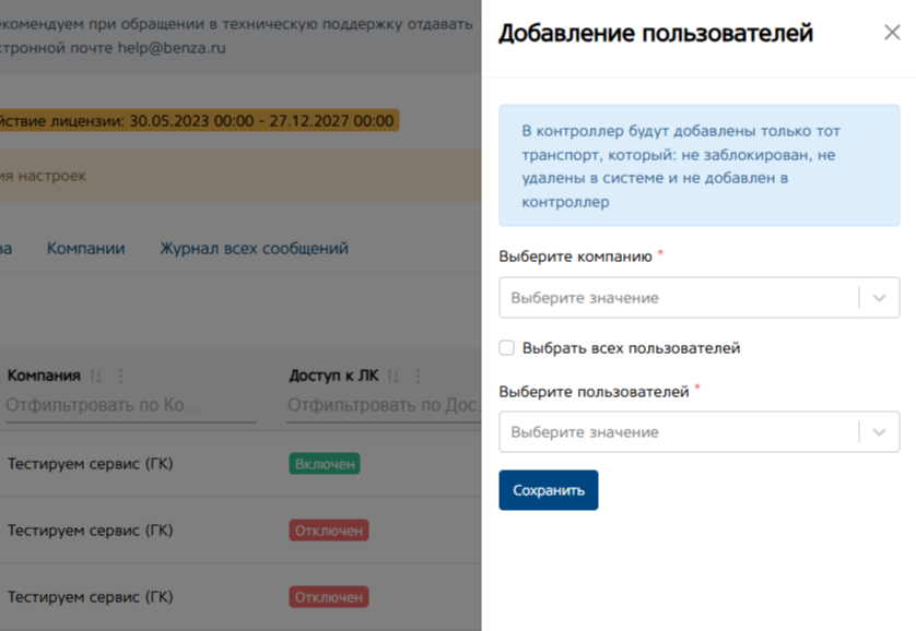 3. Выберите компанию (к которой привязан пользователь). 4. Выберите необходимого пользователя. 5. (Если нужно добавить всех пользователей компании, нажмите на галочку «Выбрать всех пользователей»). 6. Нажмите на кнопку «Сохранить».