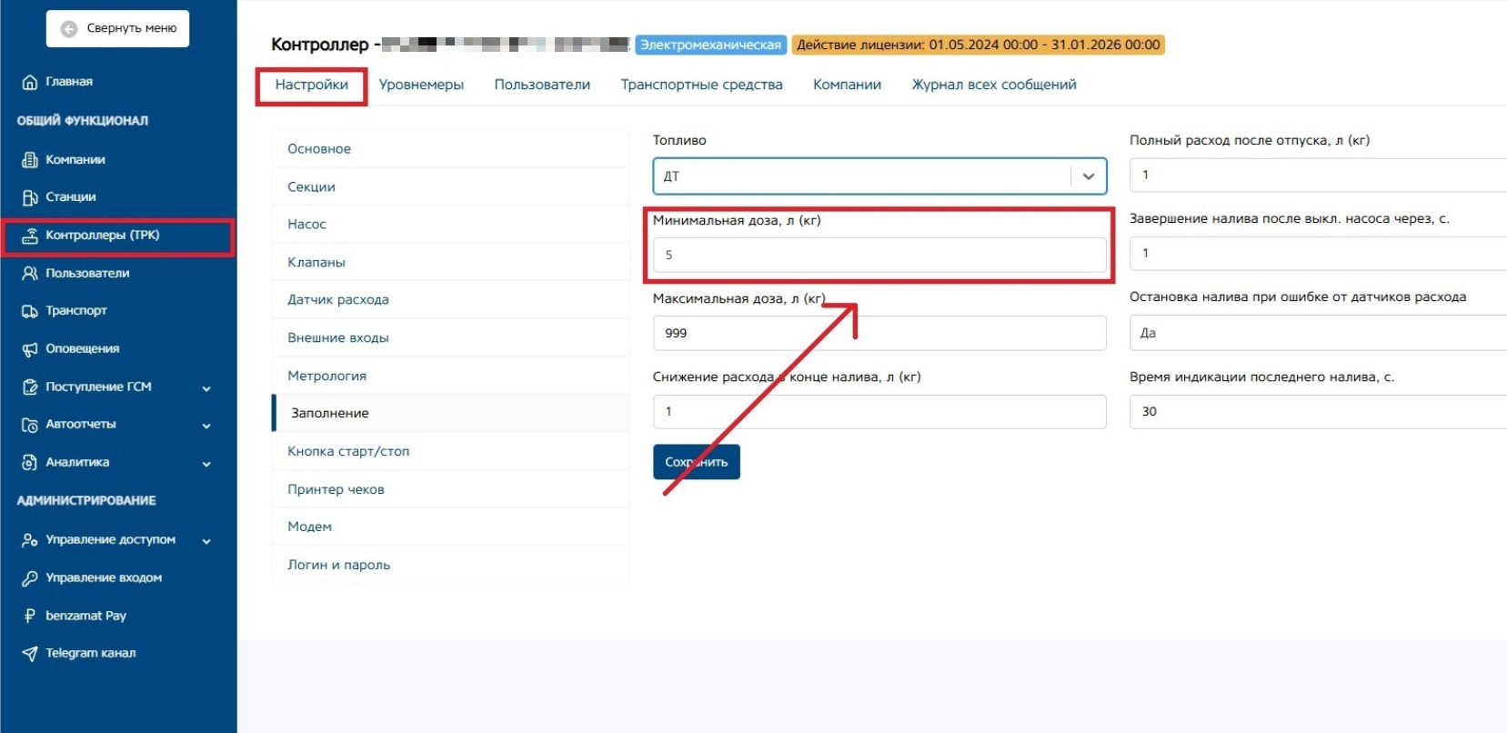 В контроллере можно установить минимальную допустимую дозу для выдачи топлива. По умолчанию это значение — 5 литров. Для корректного работы системы не рекомендуем устанавливать значение меньше 5 литров.