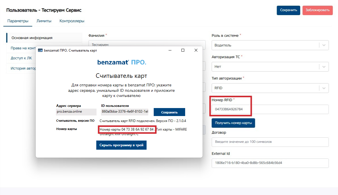Запустите программу «benzamat® ПРО. Считыватель карт», приложите к считывателю карт карту пользователя. Убедитесь, что RFID номер карты совпадает. Если RFID отличается — привяжите корректную карту к пользователю. После этого необходимо записать данные в контроллер (см. Шаг 3. Запись изменений в контроллер).