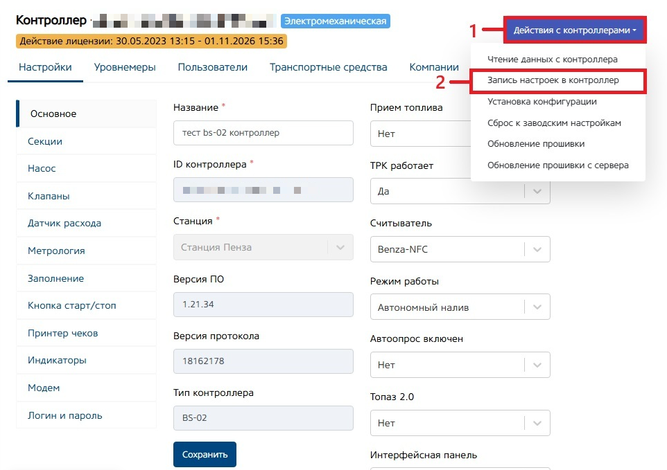 2. Нажмите на кнопку «Действия с контроллерами». 3. Нажмите на кнопку «Запись настроек в контроллер».