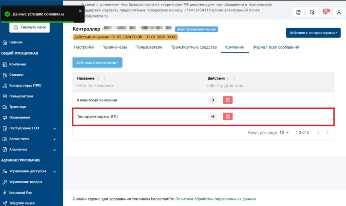 После успешного сохранения вы увидите уведомление. Компания добавлена в контроллер.